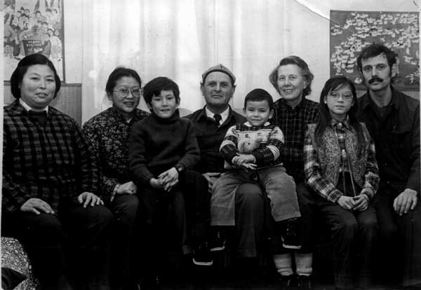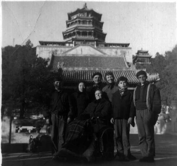 | David with wife Isabel and son Michael (right) , Beijing 1980. | David flanked by wife Isabel and family help Liu Jinfeng, sons (l-r) Michael, Paul and Carl, with mother-in-law Muriel Brown, at the Summer Palace |